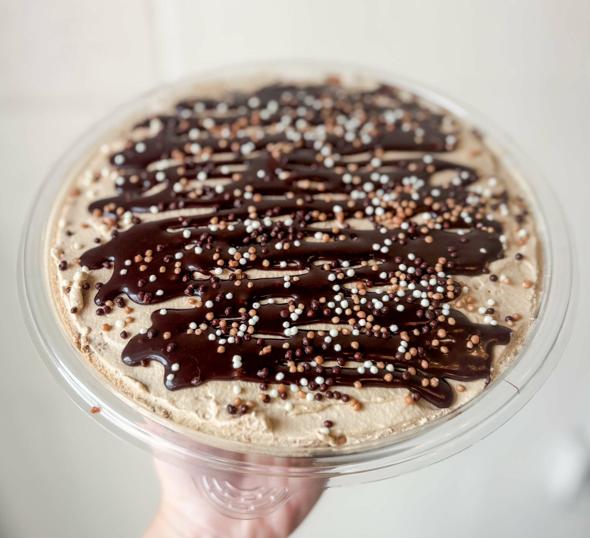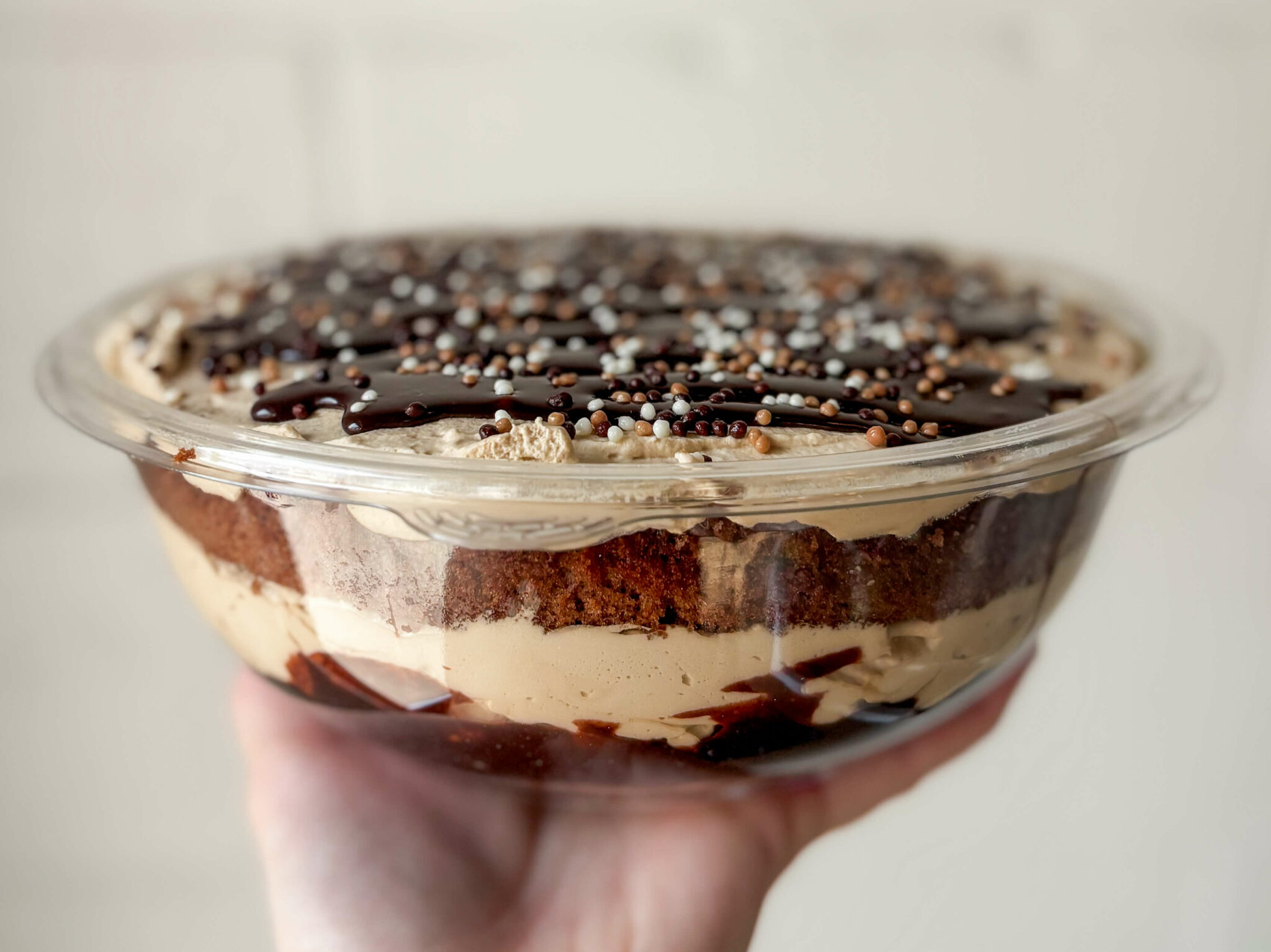 Inspired by our popular mocha torte cake, this scoop cake is the perfect fusion of bold coffee whipped cream, fluffy mocha cake, and rich chocolate fudge drizzle.