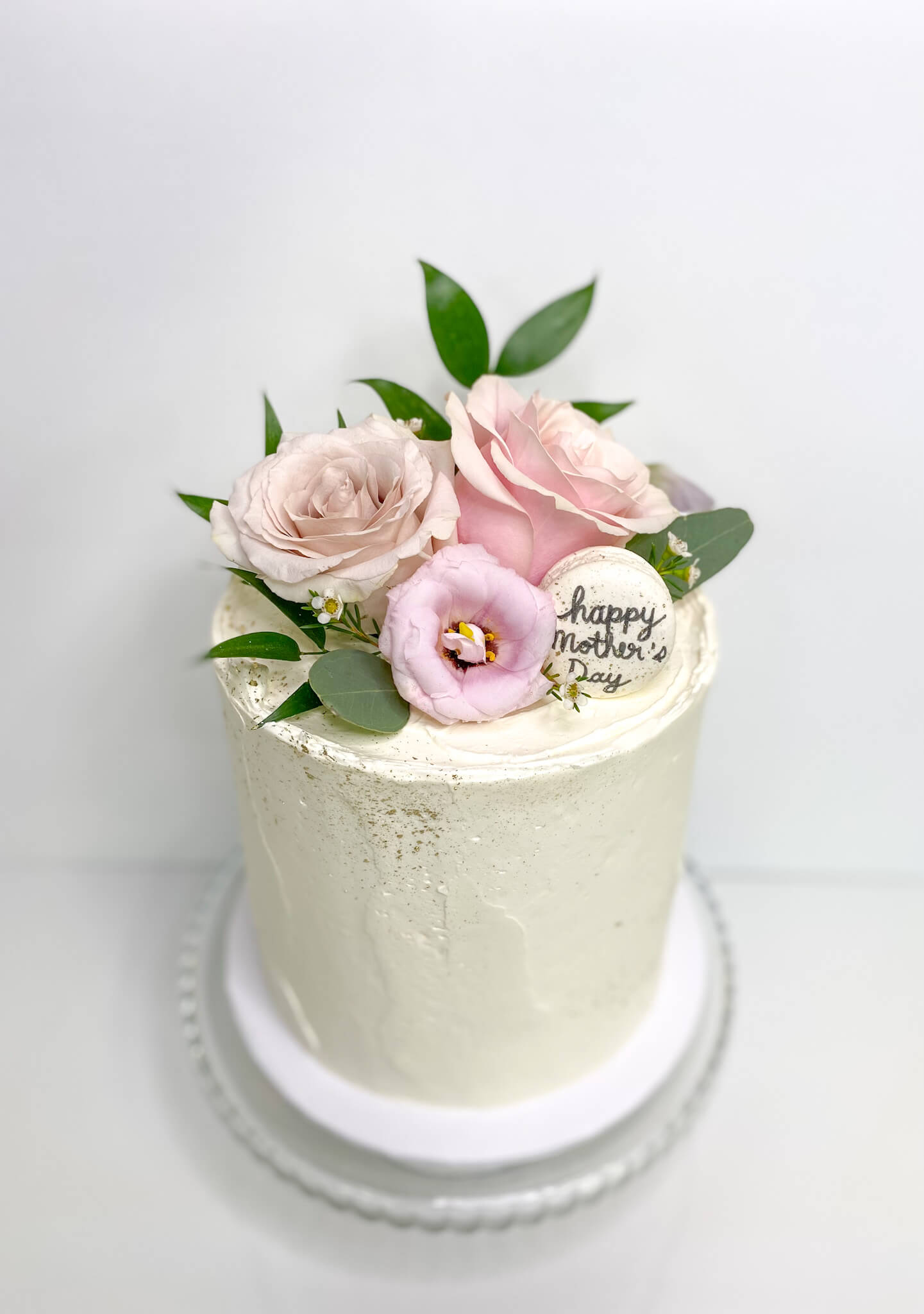 An extra special spin on our Classic Fresh Flower Cake with Gold accents and topped with a “Happy Mother’s Day” Macaron